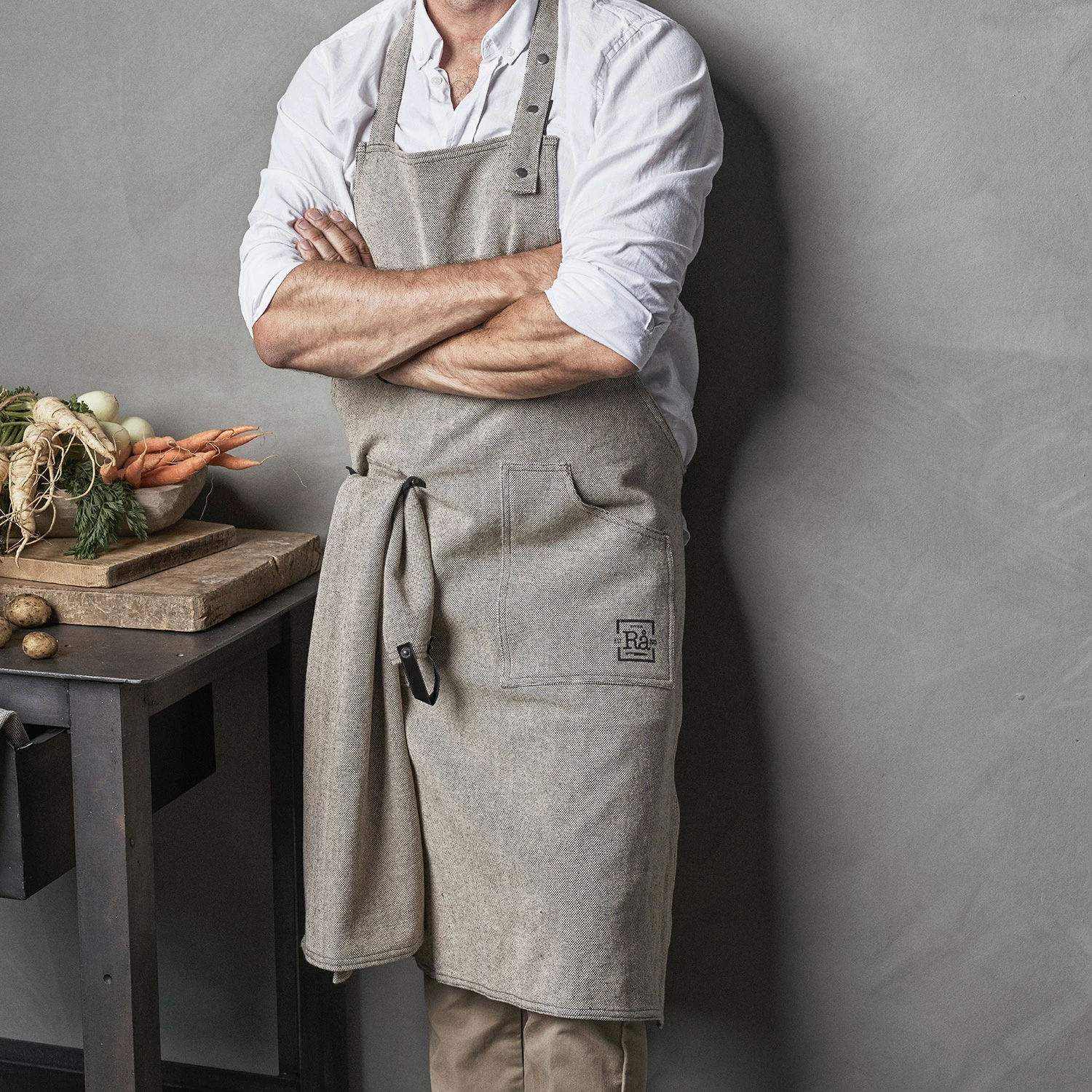 Rå apron from Juna. The apron has a rustic feeling and nice leather details with a adjustable strap. Made in 100% cotton and machine washes at 40 degrees. Not suitable for tumbler.