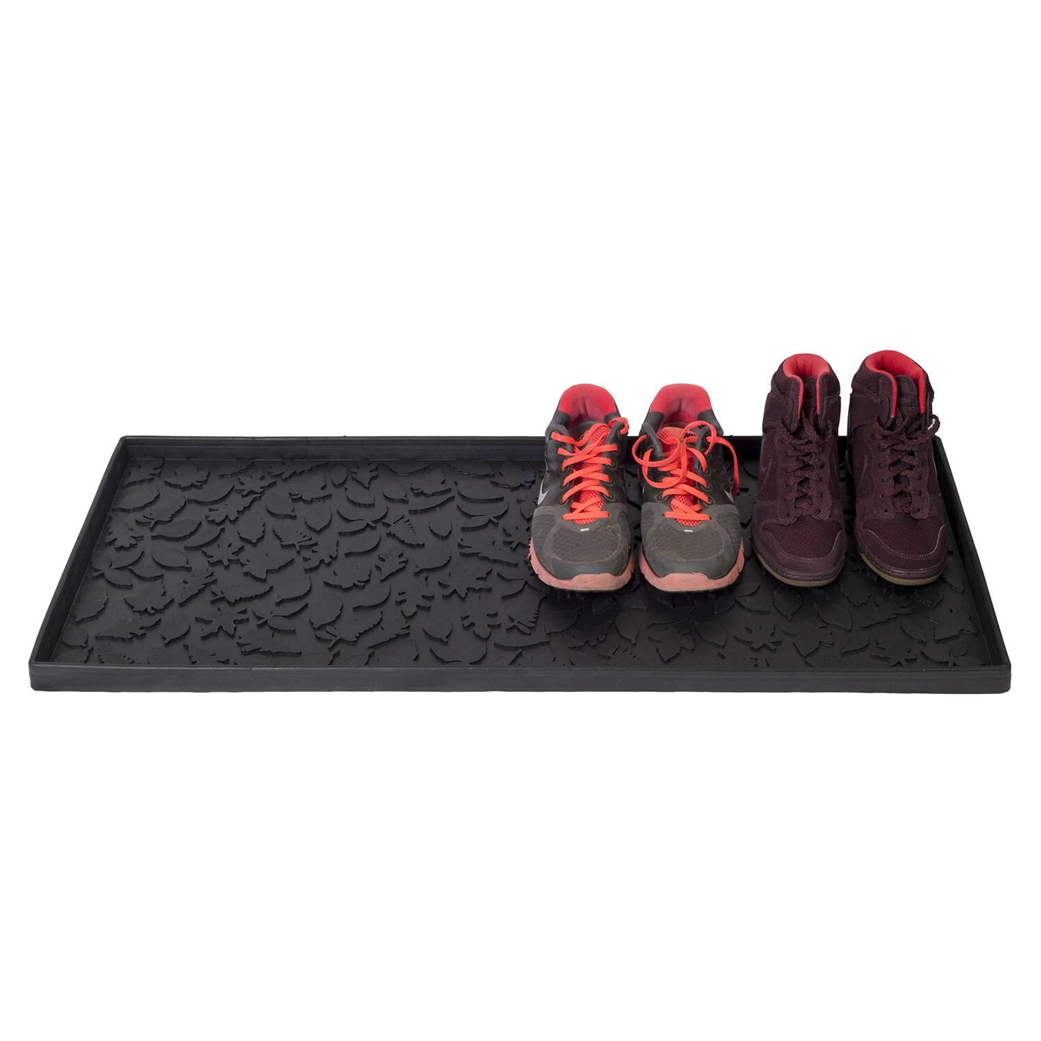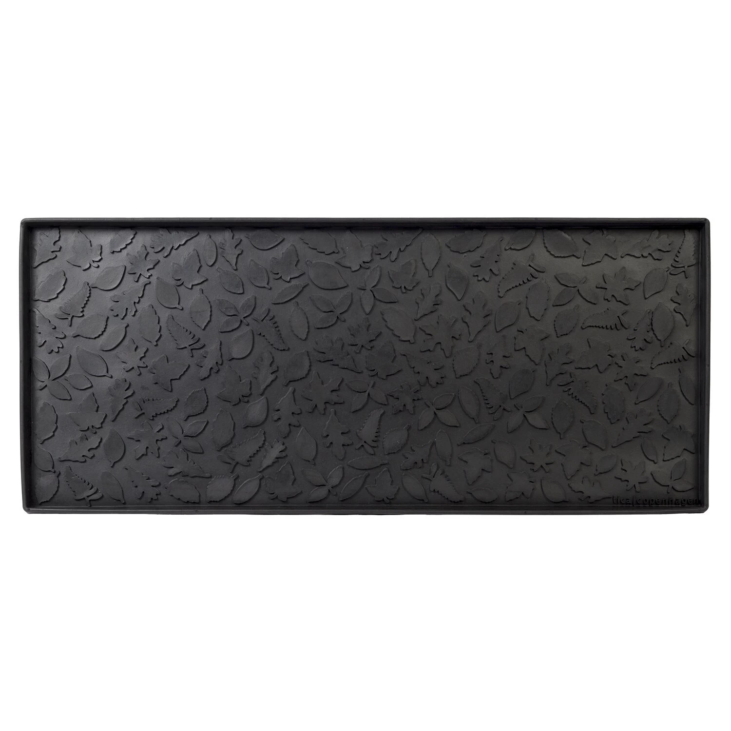 Leaf is made of rubber by Tica Copenhagen. They do not slide around like plastic shoe trays as rubber is such a robust, quality material, the trays are extremely solid and long-lasting. Also, the raised edges can tolerate being trodden on without cracking or breaking like regular plastic trays do.